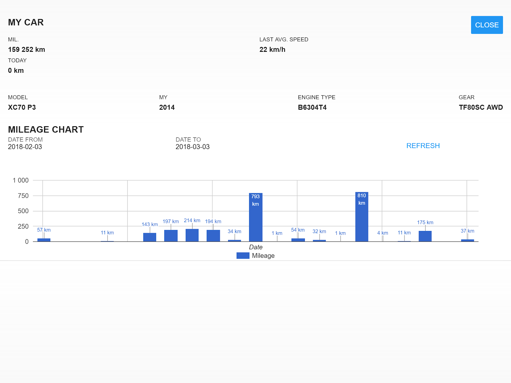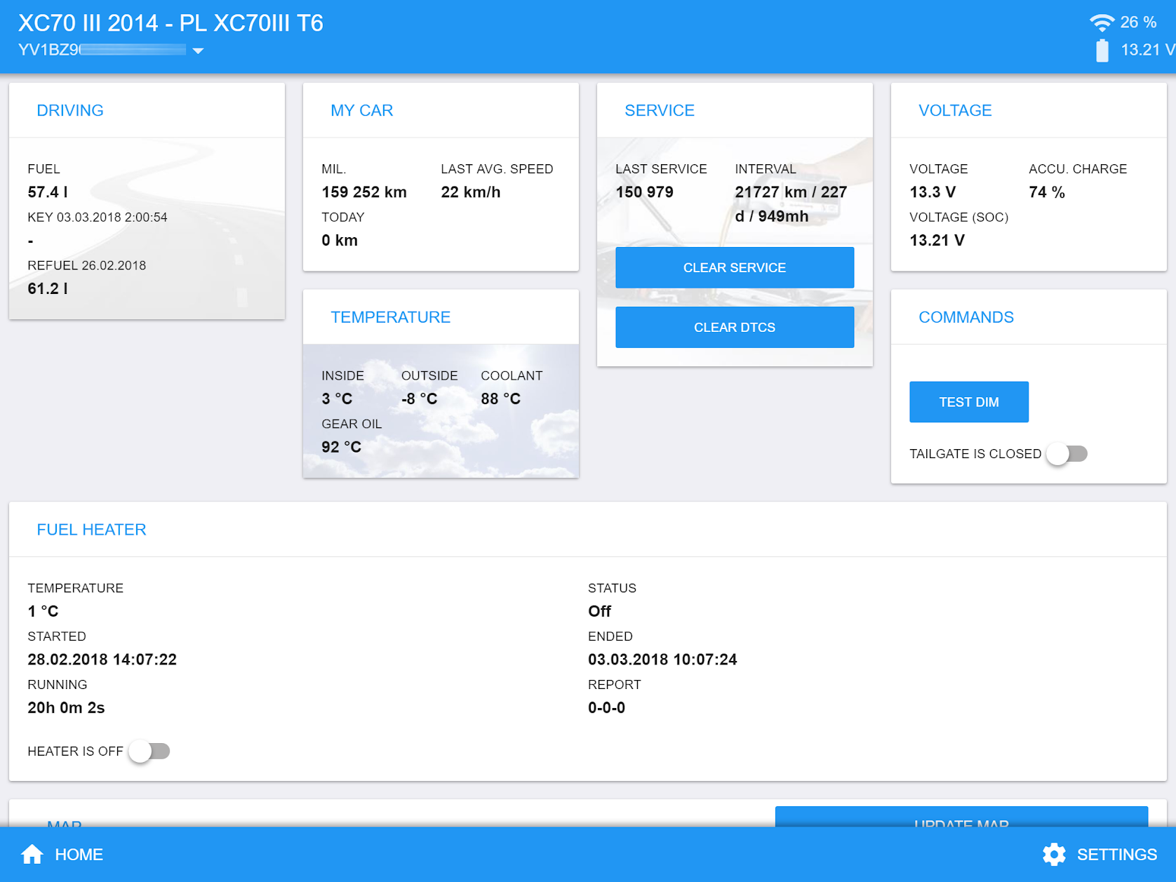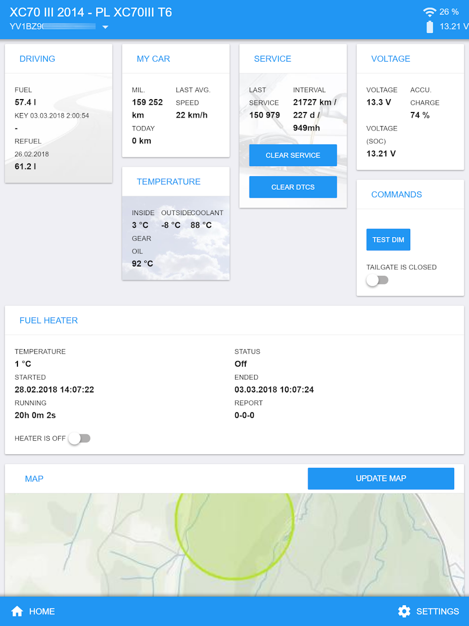 Application for remote controling Volvo cars. Service monitoring, remote controled additional functions (like starting fuel heater, air condition, ..). Remote assistance in case there's something wrong with the car or collision, log book and many other functions. Works in the whole Europe!